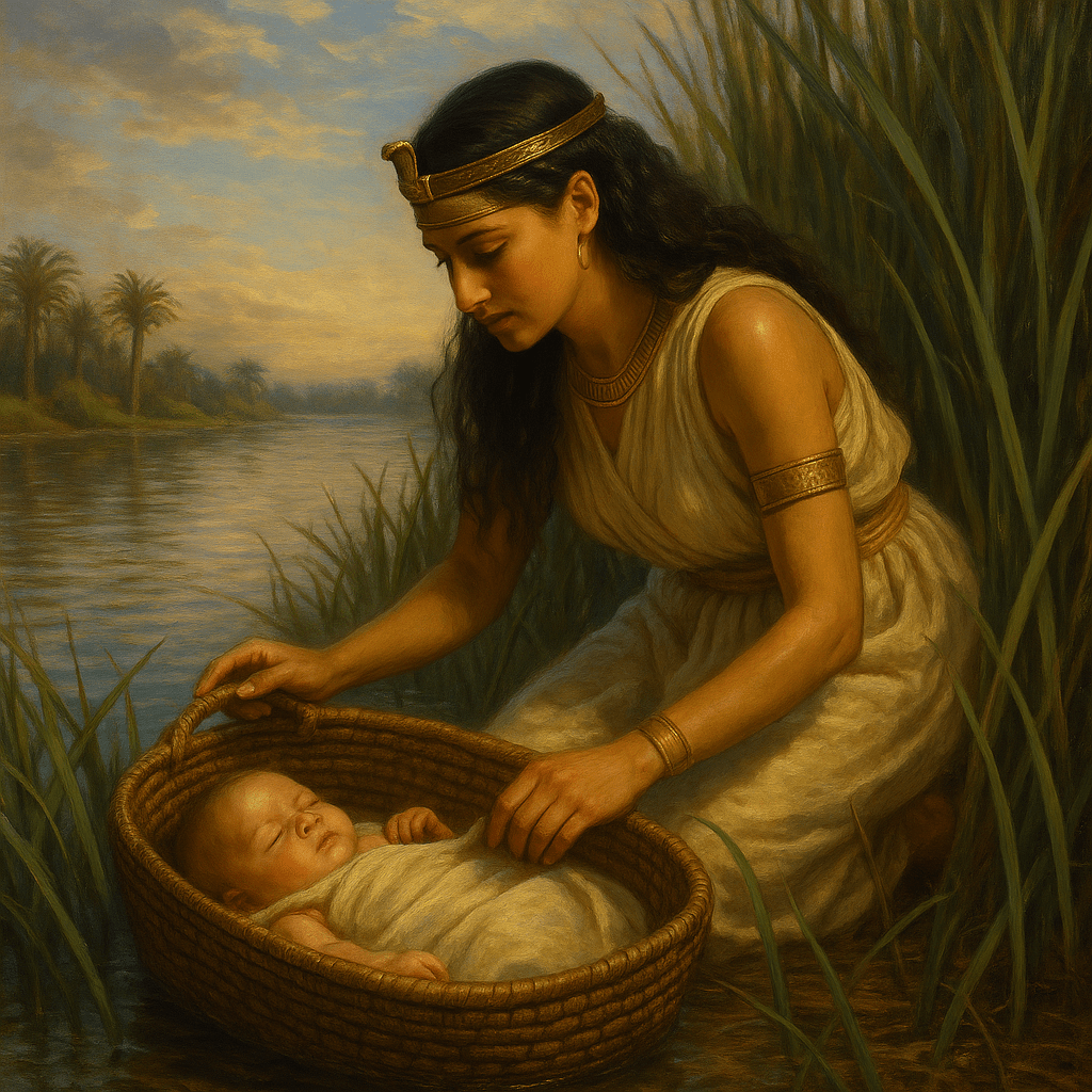Moisés é educado na corte, mas jamais perde a identidade hebreia. O nome מֹשֶׁה (Moshéh) significa “retirado das águas”, e aponta profeticamente para o Êxodo, quando Israel será também retirado das águas.